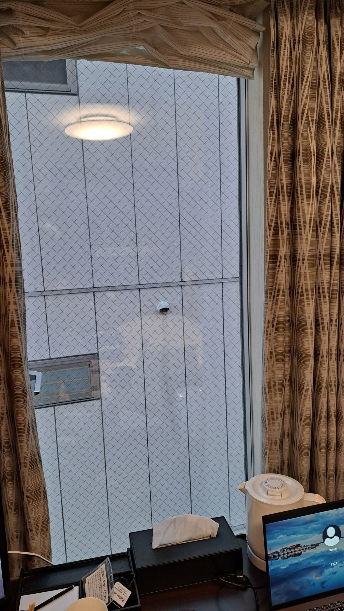今回のホテル、窓の外は、お隣のビルの壁です (≧▽≦)