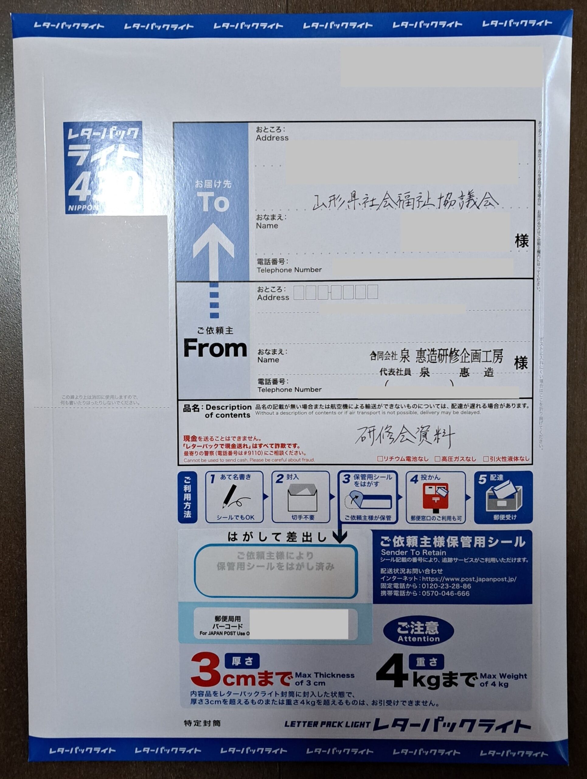 レターパックに封入のうえ、