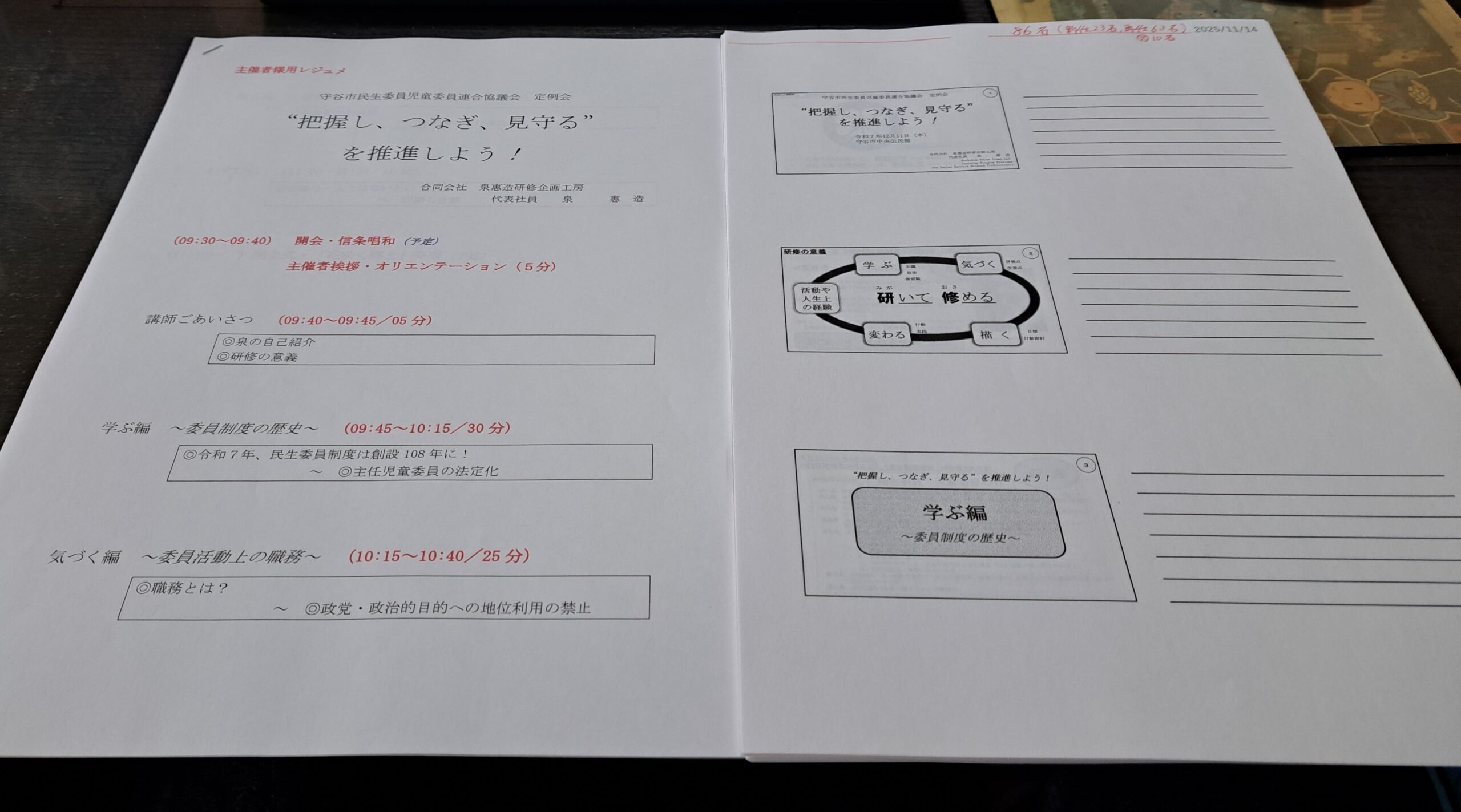 研修当日、研修の場に登壇する際の手元用メモ、