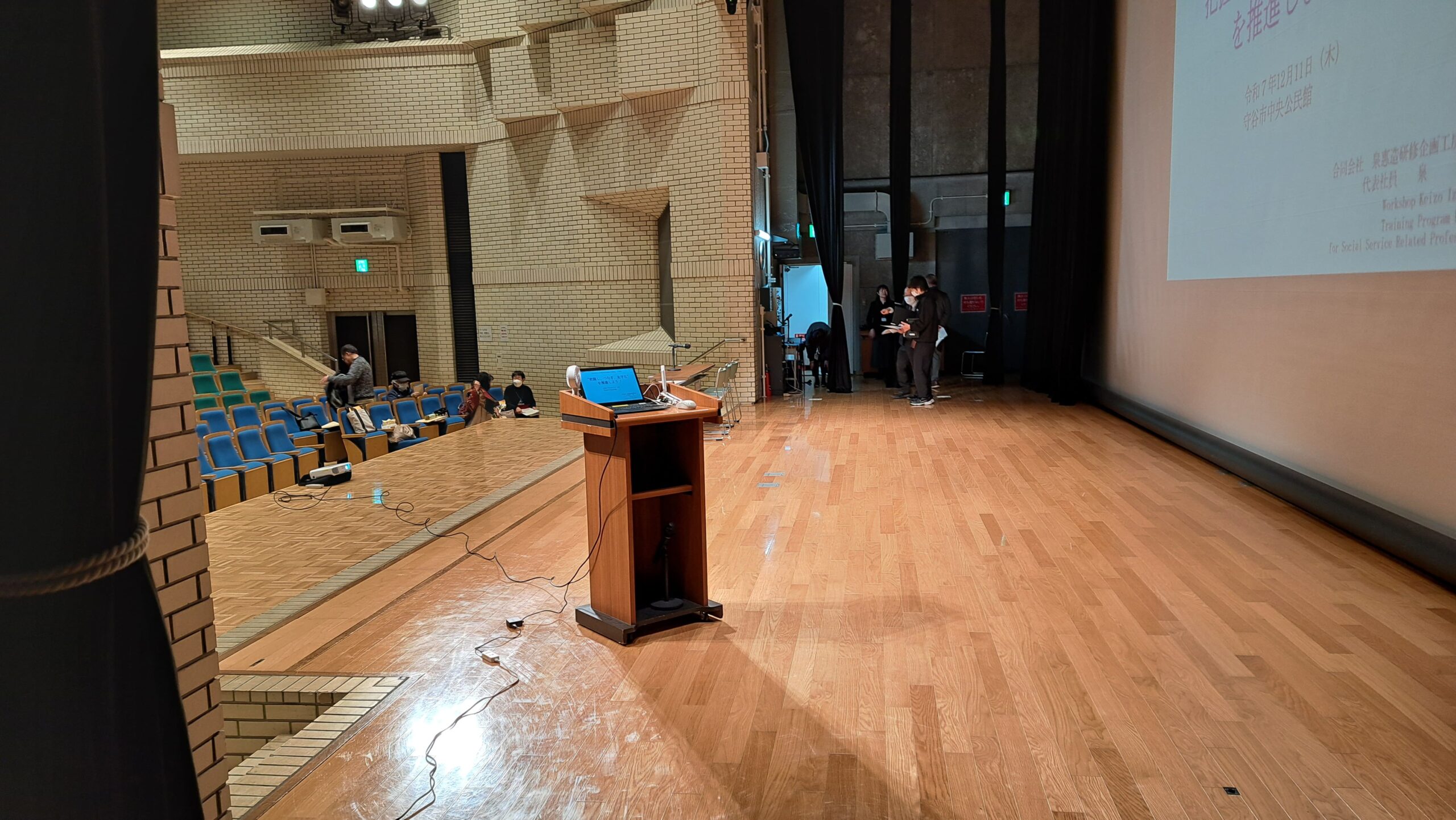 本日の会場に入り、舞台上の準備を進めます。
