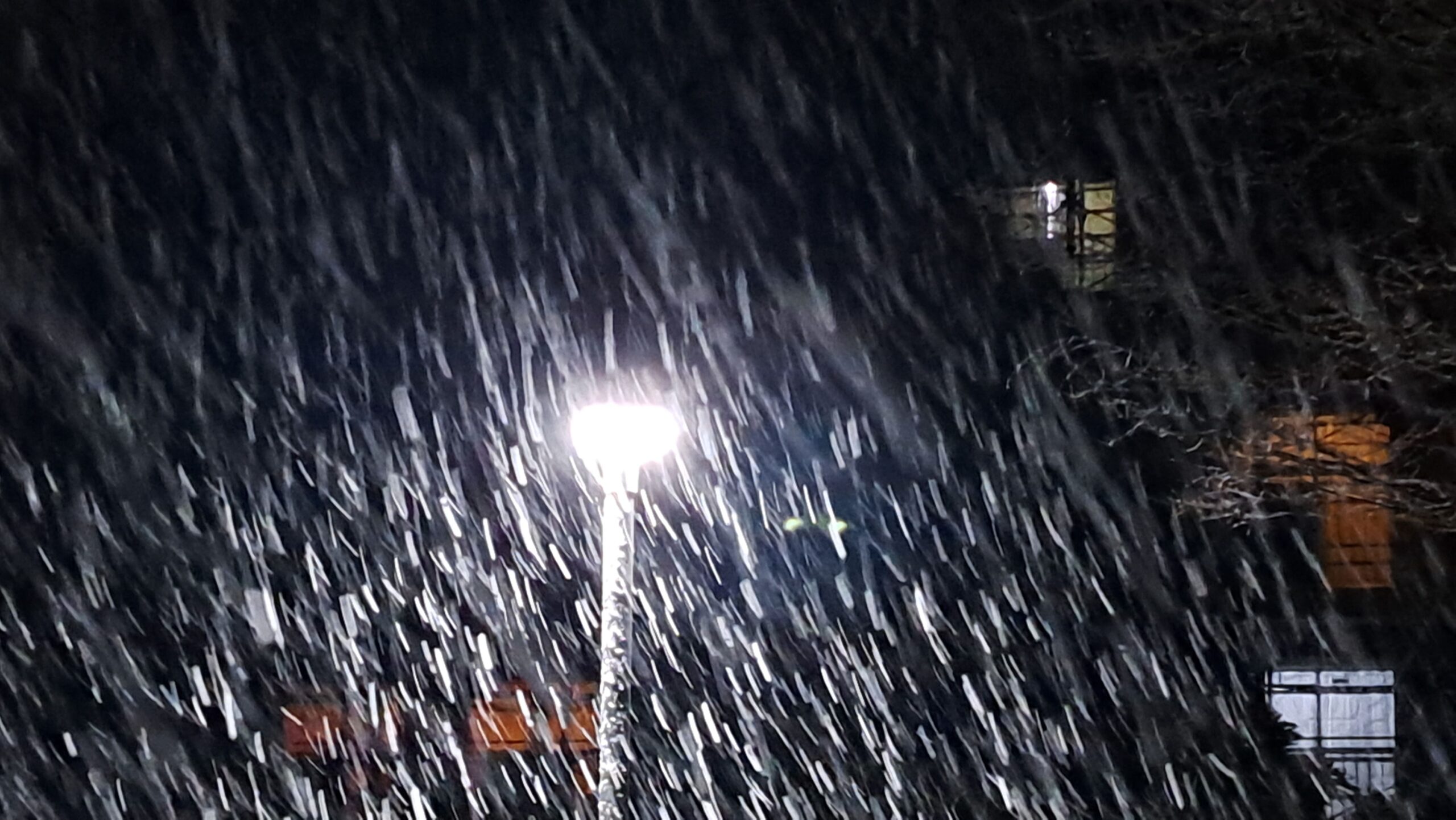 風をともない、かなり強く降り続け、