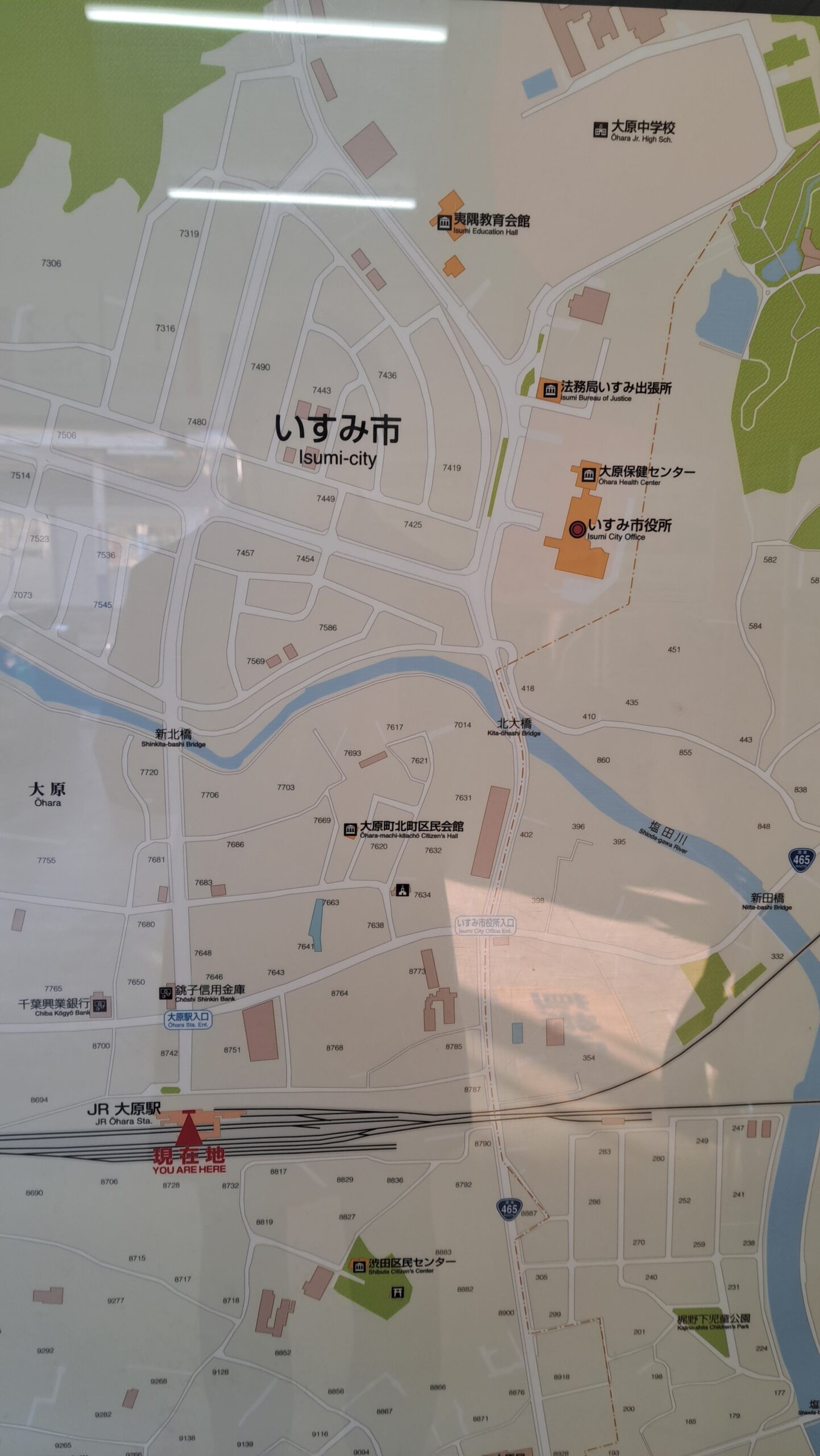 大原駅からは、地図の右上にあるいすみ市役所です。
