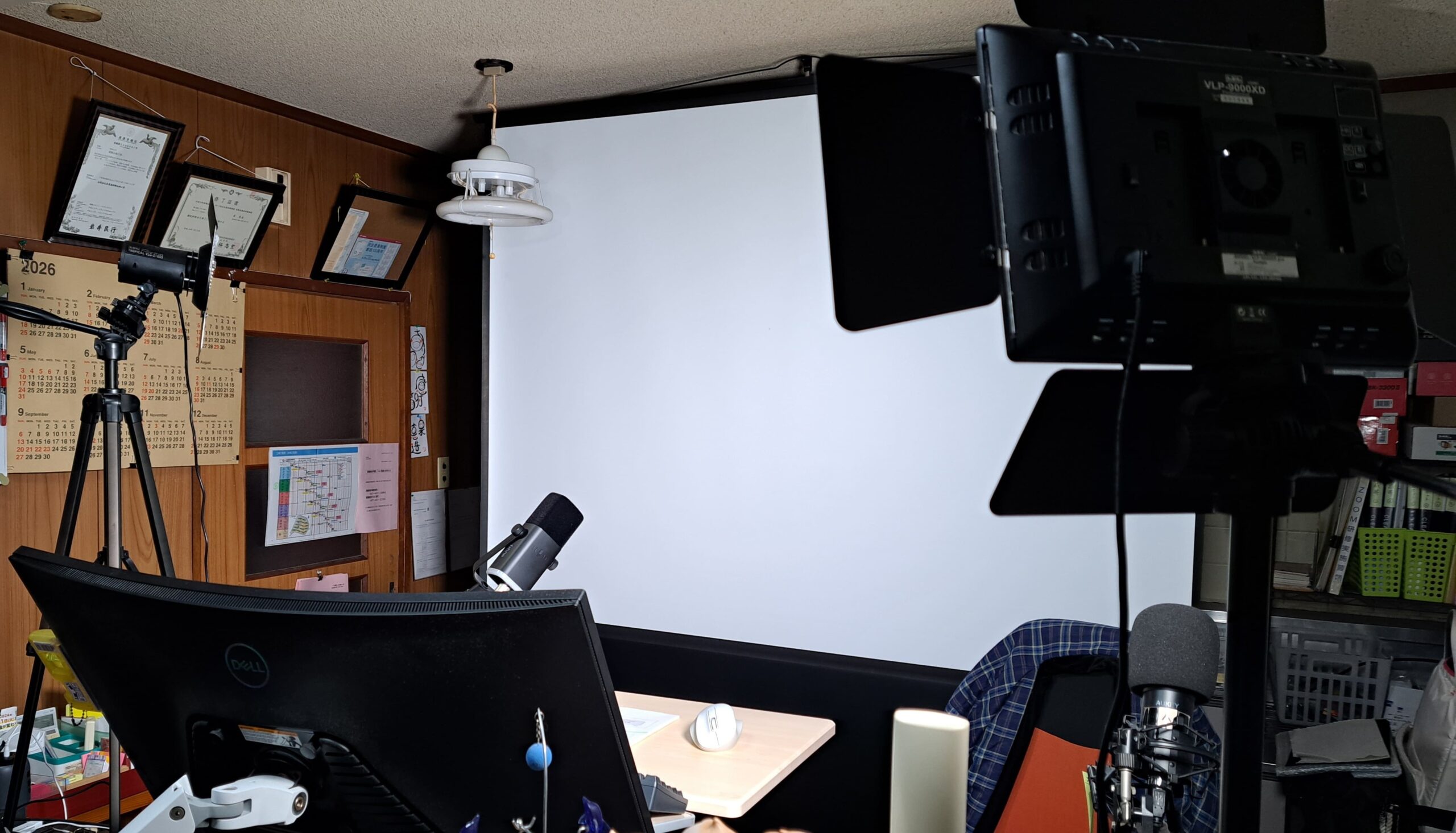 背景には、プロジェクタスクリーンを張り、