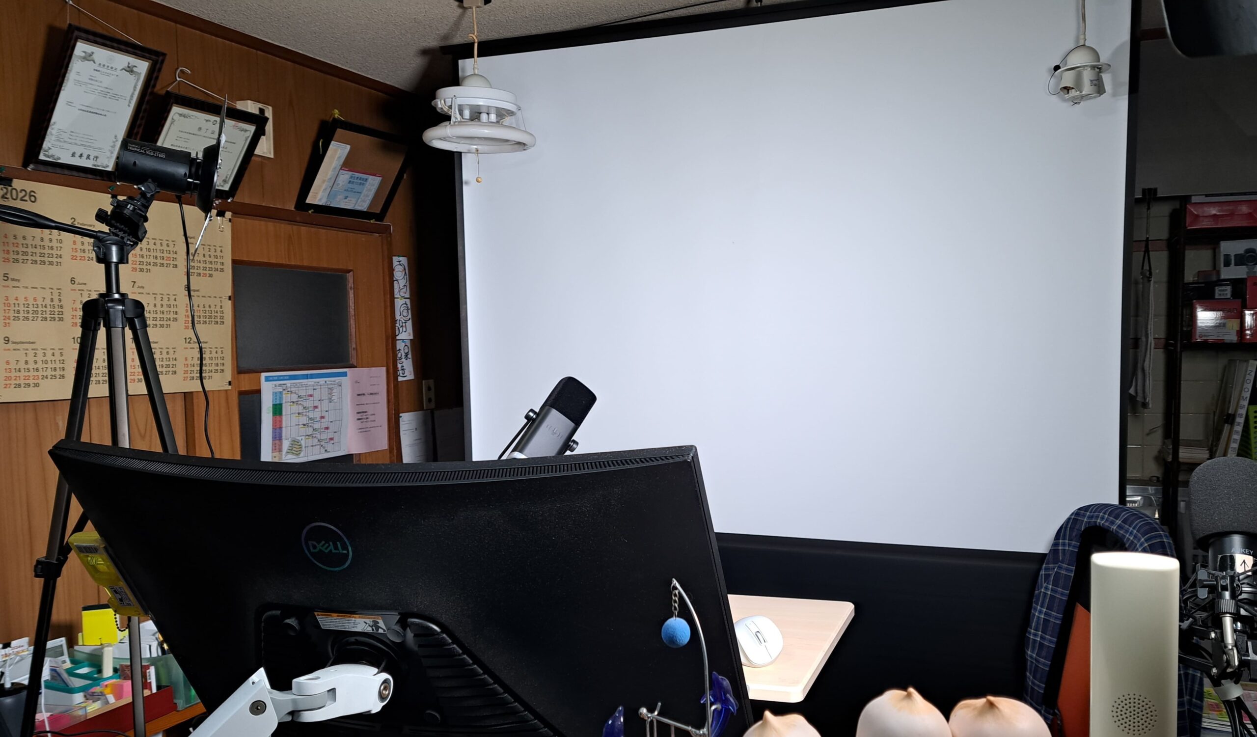 背景には、プロジェクタスクリーンを張り、