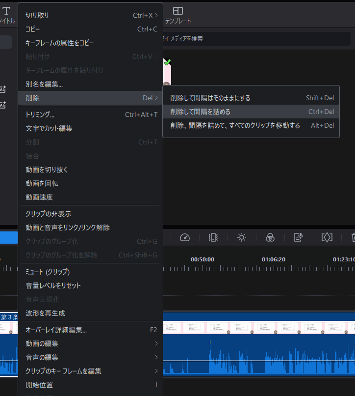 『削除、間隔を詰めて、すべてのクリップを移動する』
