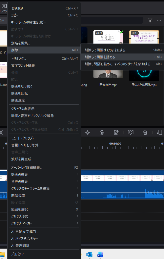 『削除、間隔を詰めて、すべてのクリップを移動する』