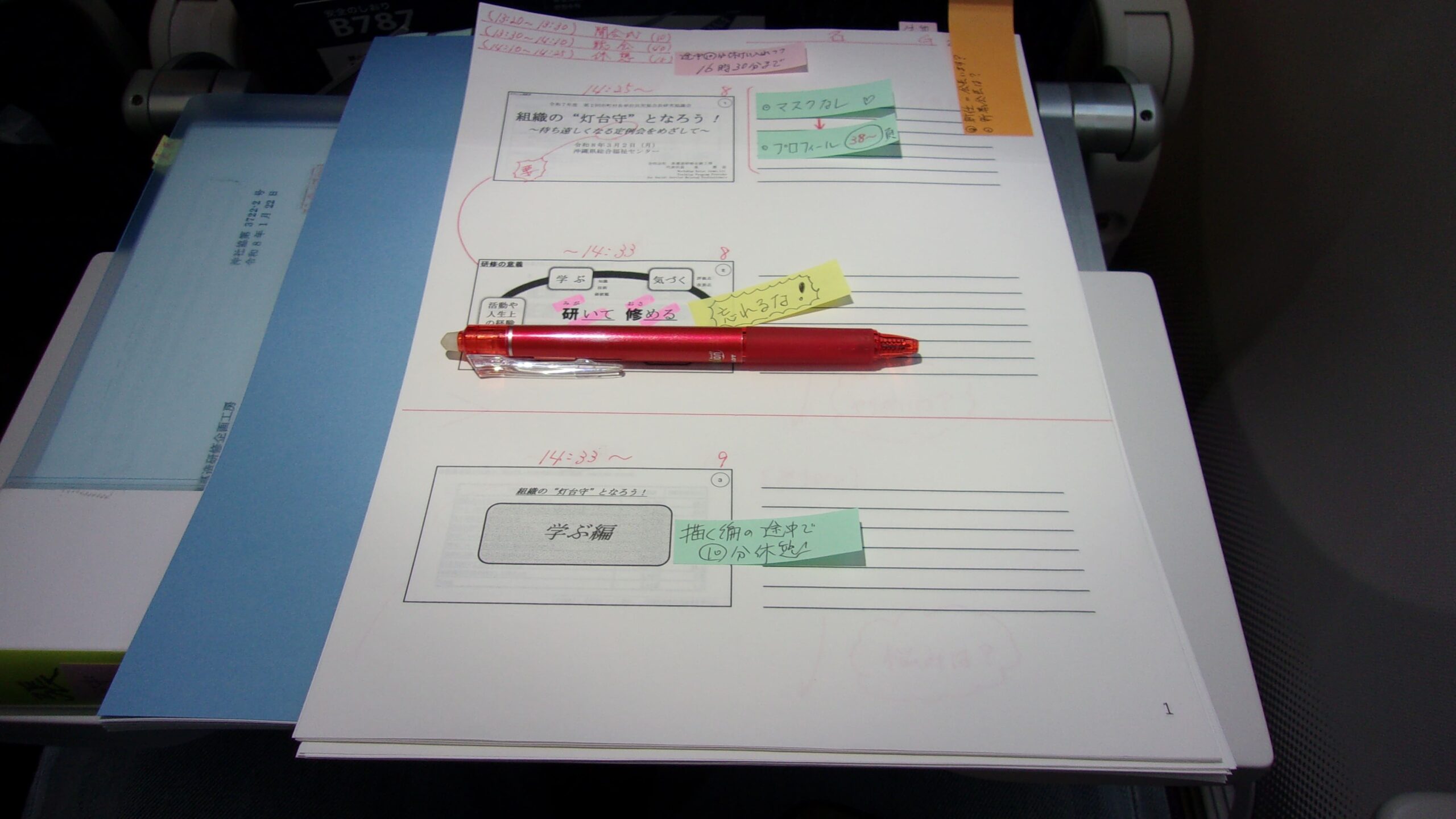機内では、明日登壇する研修会資料の