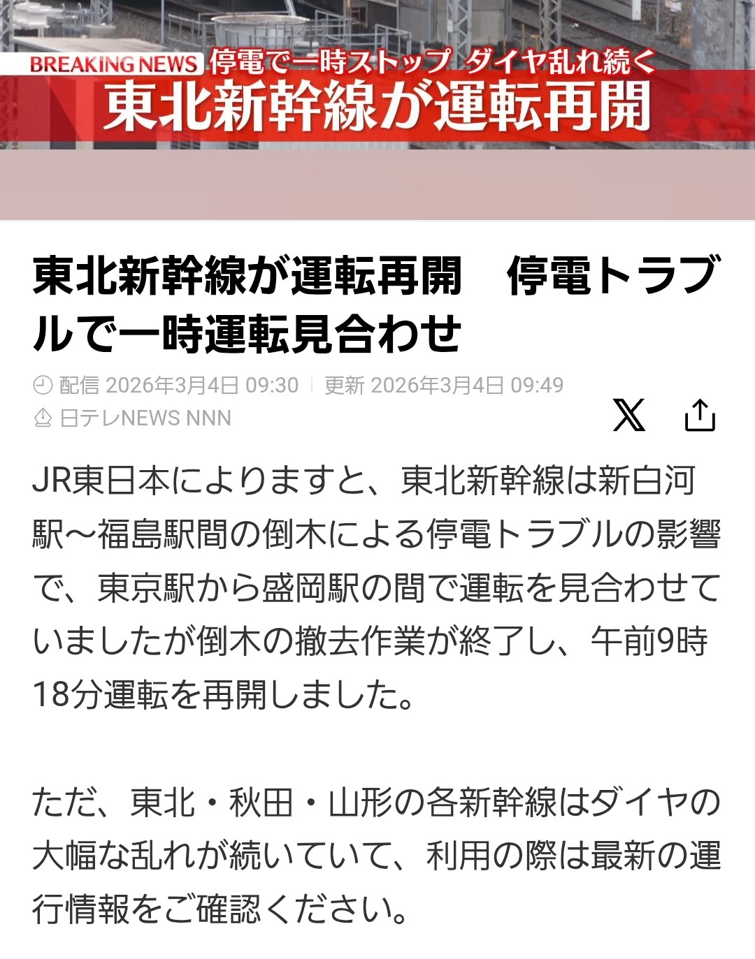 移動の途中で、新幹線の運転は再開したと伝わりました。
