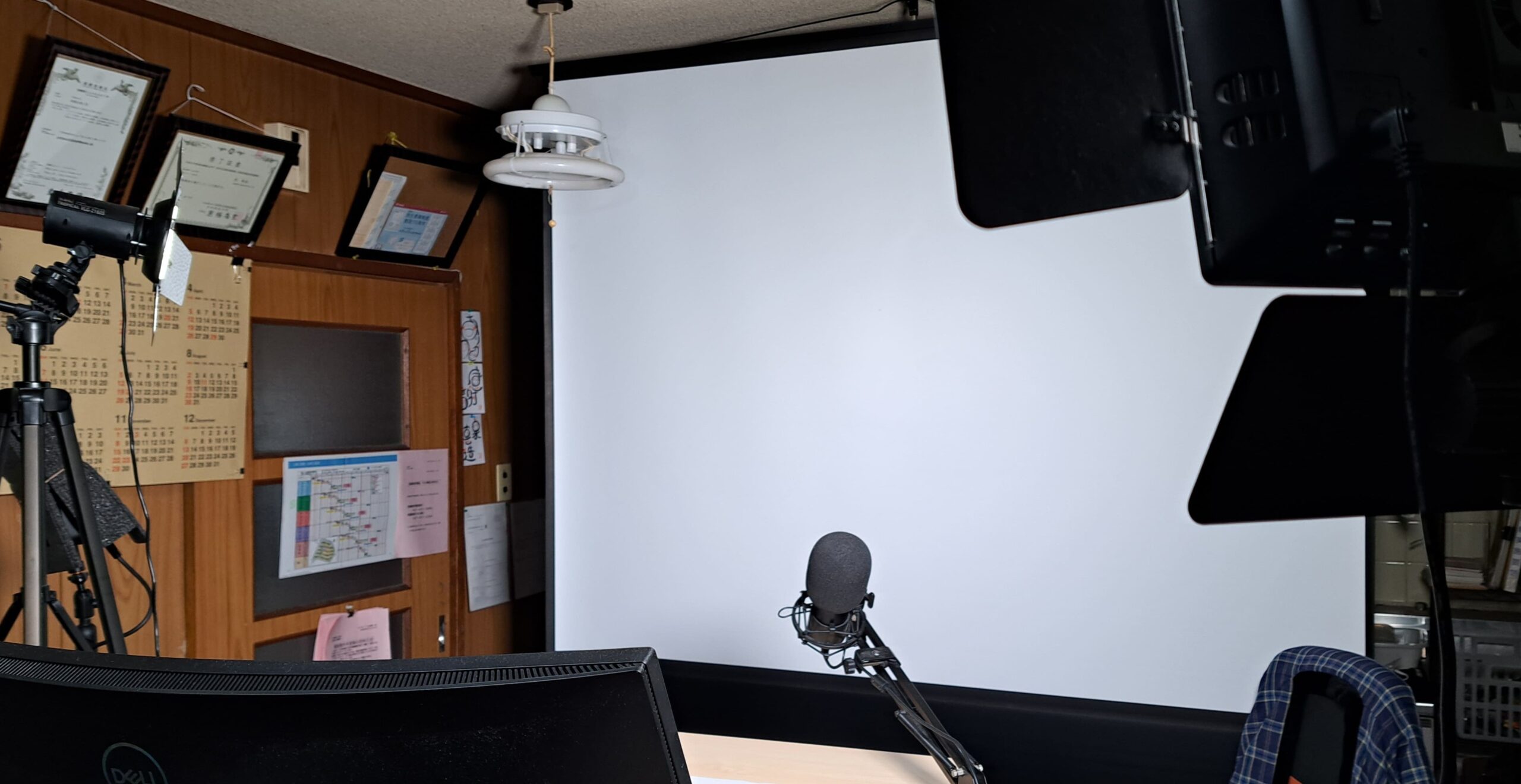 背後にはプロジェクタースクリーンを張り、